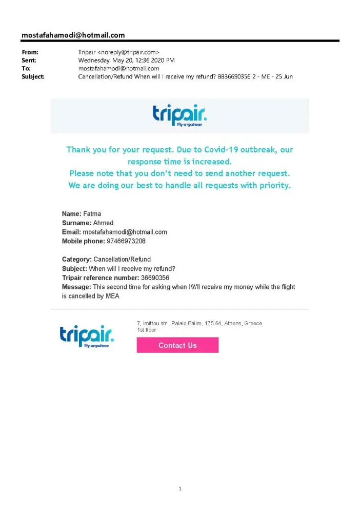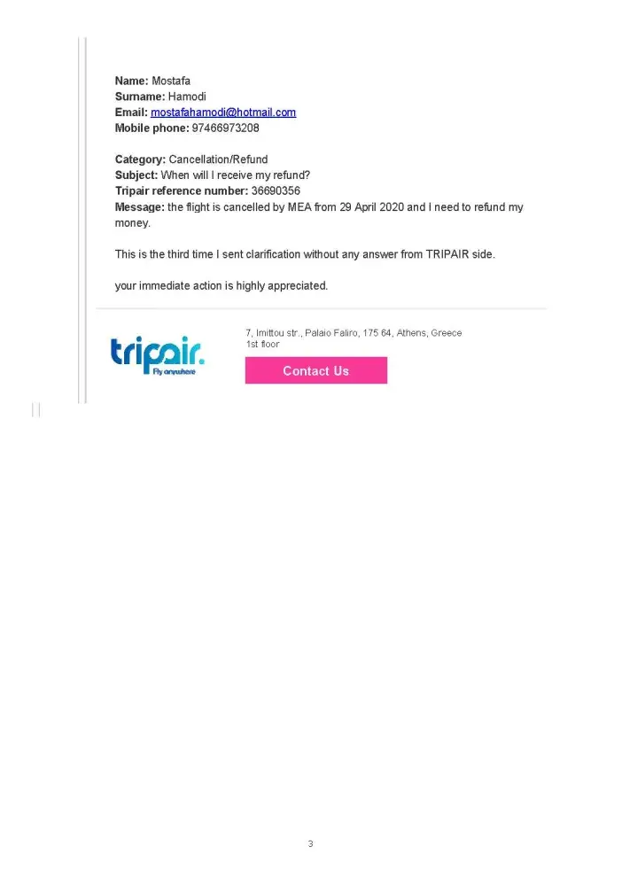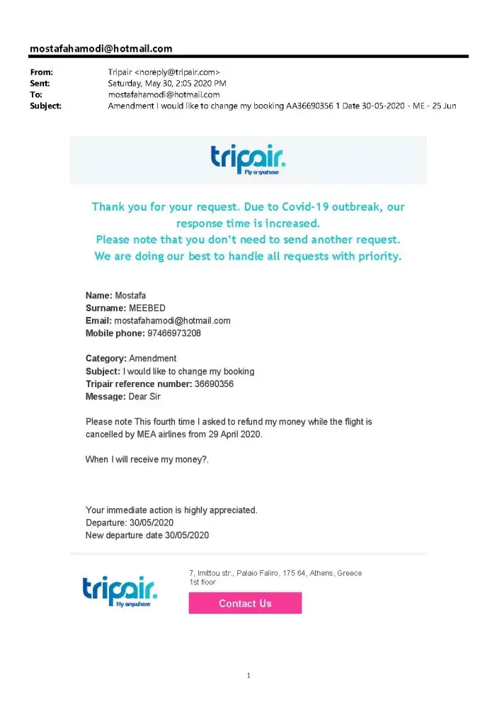 I bought two tickets via tripair. My flights were cancelled because of Corona. More than 4 months I have been trying to contact tripair to transfer my money back. They have not answered any of my emails. The line all the time busy. Sometimes I call them more than 40 times per day but all the time the line is busy. I really started to go to the court to complain about tripair.