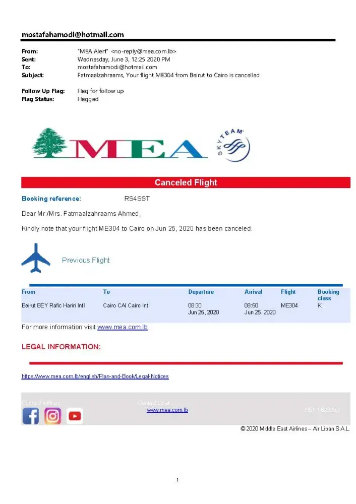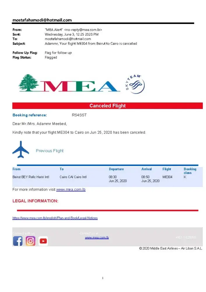 I reserved (02) tickets by tripair agency and the flight is cancelled by MEA airlines (Operator) from 29th April 2020.