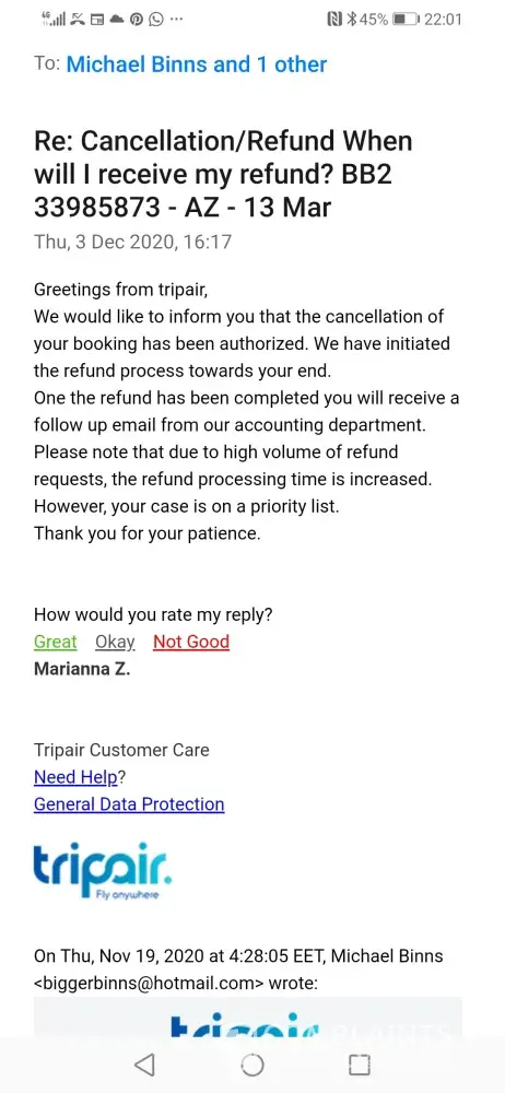 I have received several emails from Tripair stating my refund has been authorised and should be with me in several weeks, but it still has not materialised!
