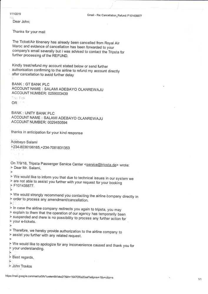 non refund of cancelled air maroc ticket 1475364883820/1475364883819 salami
