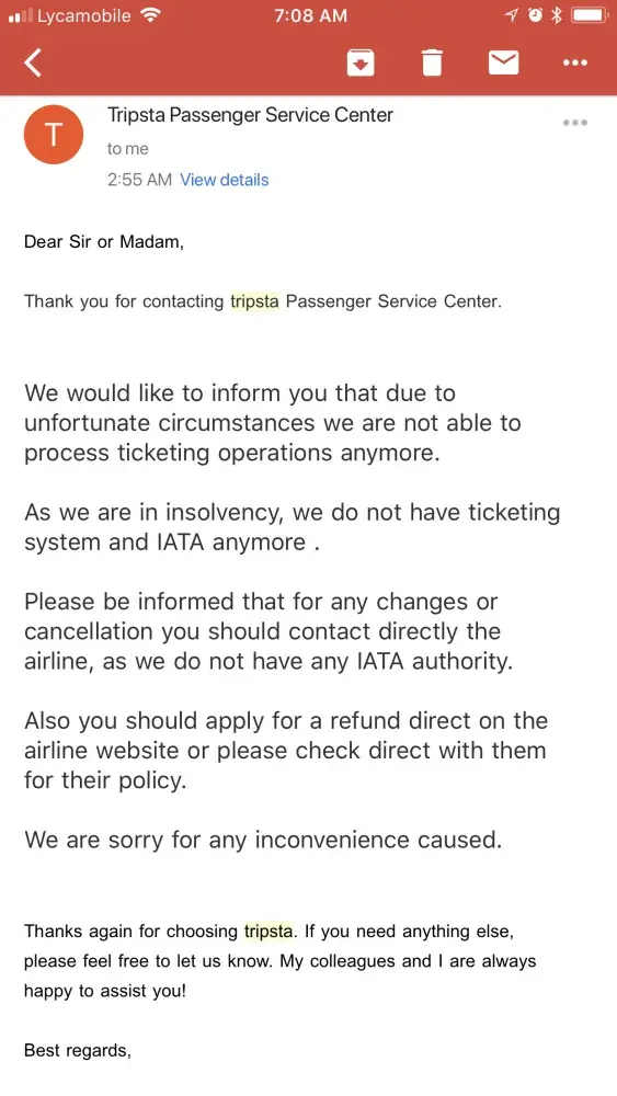 I bought an airline travel ticket from online booking agent Tripsta. Due to medical reasons, I had to cancel it. Tripsta has stopped tradind and looks like had gone bust. Theu do not snswer phone. Any email sent to them comes back with autogenerated email asking to contact airline directly for making changes or cancellation of unused ticket as they have stopped trading/operations . However airline is refusing and asking me to go back to Tripsta.
