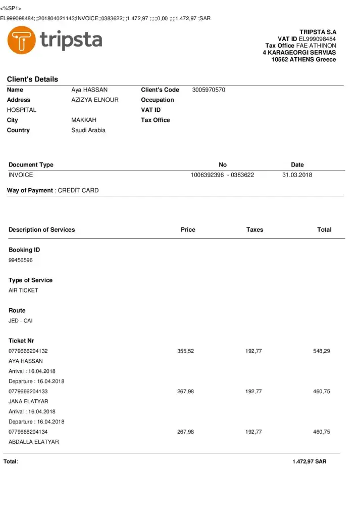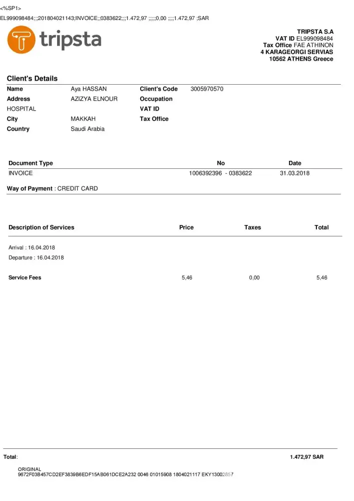 TRIPSTA S.A VAT ID EL999098484 Tax Office FAE ATHINON 4 KARAGEORGI SERVIAS 10562 ATHENS Greece
