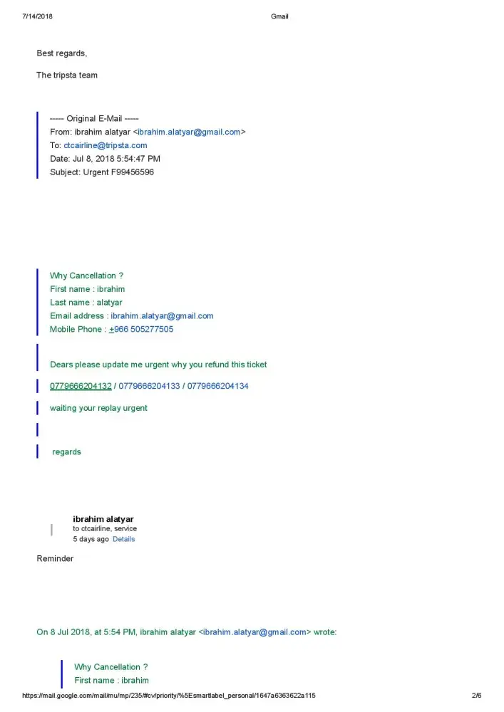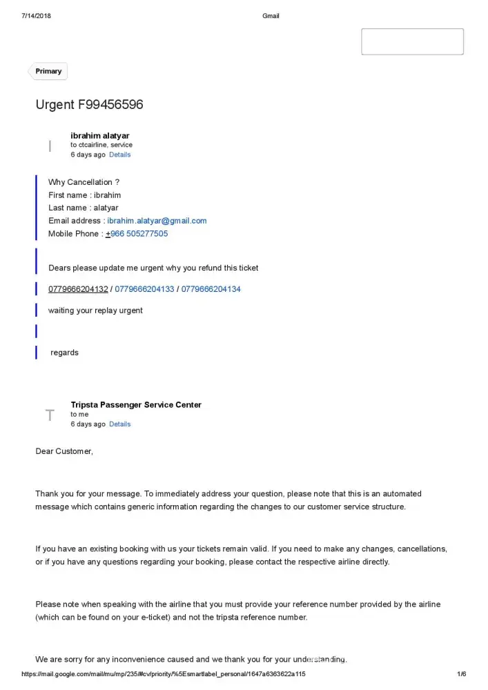 Tripsta is operating fraudulently and should be prosecuted for ripping of travellers with the absence of any customer support, their phoney website and a complete absence of anyway of contacting them post booking (phoney contact numbers, automated responses to emails telling you to go talk to the airline directly and the airlines telling you you have to talk to the agent...). unbelievable that a company can operate in this way.