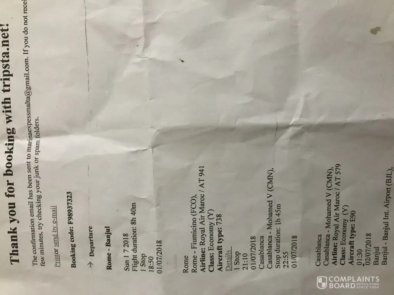 Tripsta charged 648 euros for flight ticket rental round trip from Rome to Banjul and didn't send me the