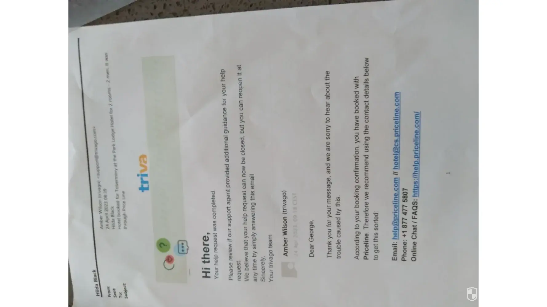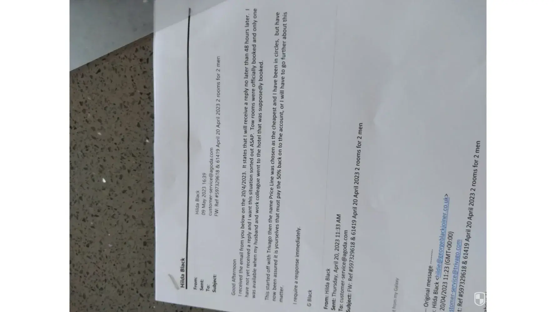 Booked a hotel for 2 men and 2 rooms at Tobermory for work. When the men arrived there was only 1 room available. I have been round in circles trying to sort this out, and the bottom line is, We require 50% of our money back. The booking ref confirmation numbers were [protected] & [protected] and a trip no. [protected]. in the first inst no confirmation came through, but after finally doing a chat with Price Line I received confirmation. Since then I have been told it is nothing to do with Trivago but to contact by email Agoda. I have done this an they do not recognize my email address and state that it is nothing to do with them. PLEASE SORT THIS OUT AND I WANT MY MONEY BACK - G BLACK.