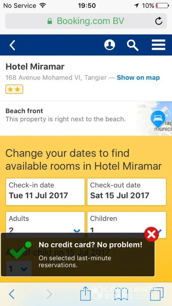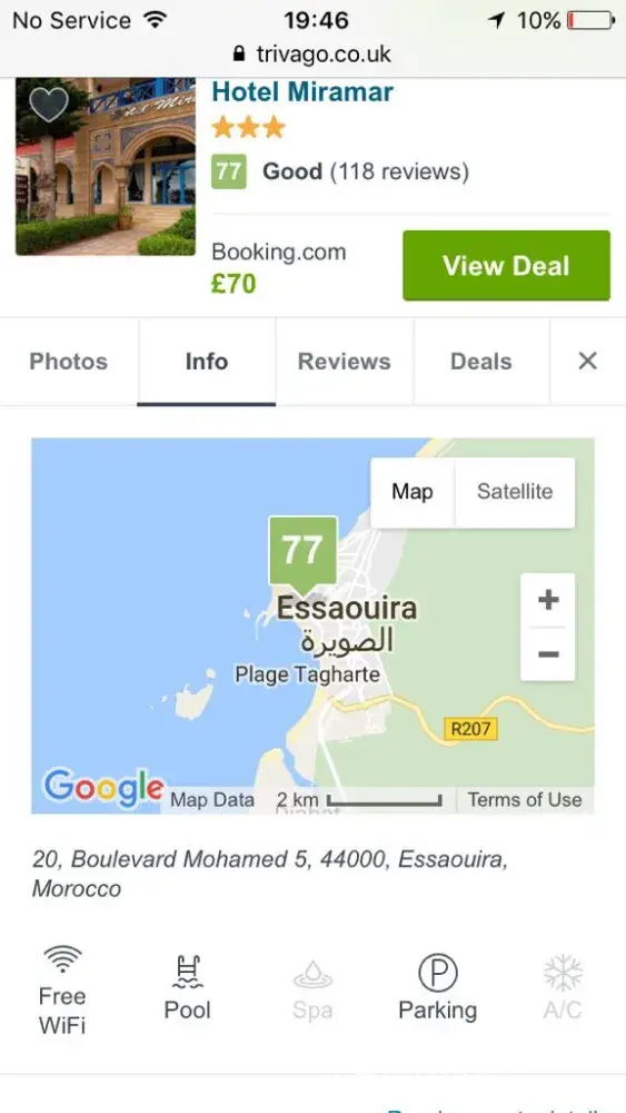 The next day, after further arguments with the hotel, it transpired that we had been booked at the wrong hotel - Hotel Miramar in Tangier. I had to phone Booking.com to cancel the hotel in Tangier, call lasted about 20 minutes and was charged £34.50. The hotel managed to provide us a room but at a higher rate of £59.21 per night.