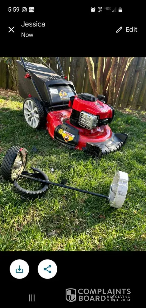 We recently bought a new Troy-bilt mower after our old one finally gave up after 10 years of hard use. Well after the first 10 minutes this new one fell apart. After inspecting the damage I found that the front and rear wheel assemblies are held on by cheap plastic clips and after the first bump in the yard it came off and got damaged. I contacted Troy-bilt...