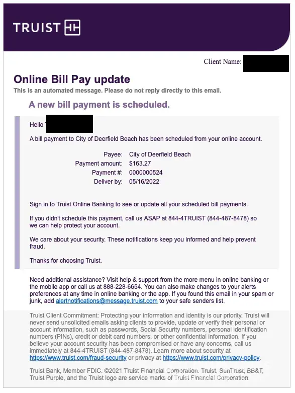Truist failed to pay a scheduled bill pay but shows it paid and processed