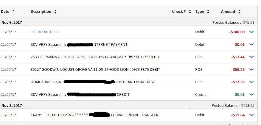 I've been banking with BB&T since 2006 (the only bank I've ever used) and I STRONGLY RECOMMEND YOU LEAVE IF YOU HAVE AN ACCOUNT WITH THEM. They were awesome at first, not one complaint until 2017. A sociopathic CEO must have taken over because they have become extremely predatory. First of all, transactions do not show up on your account until several days afterwards. In the meantime, they don't reflect on your available balance, so it causes confusion. I admit I could take more care in balancing my "check book, " but this was NEVER an issue with BB&T before. I used to pay a bill, refresh my online banking page, and immediately see the charge there.
