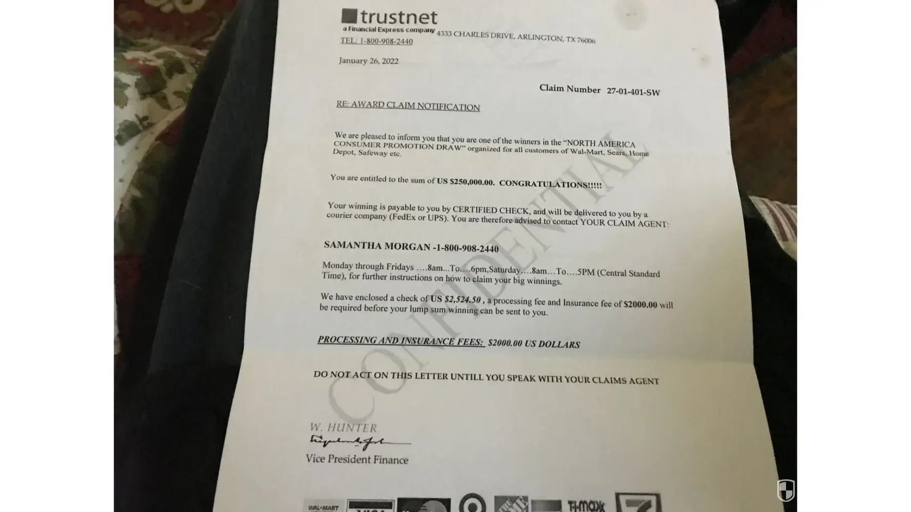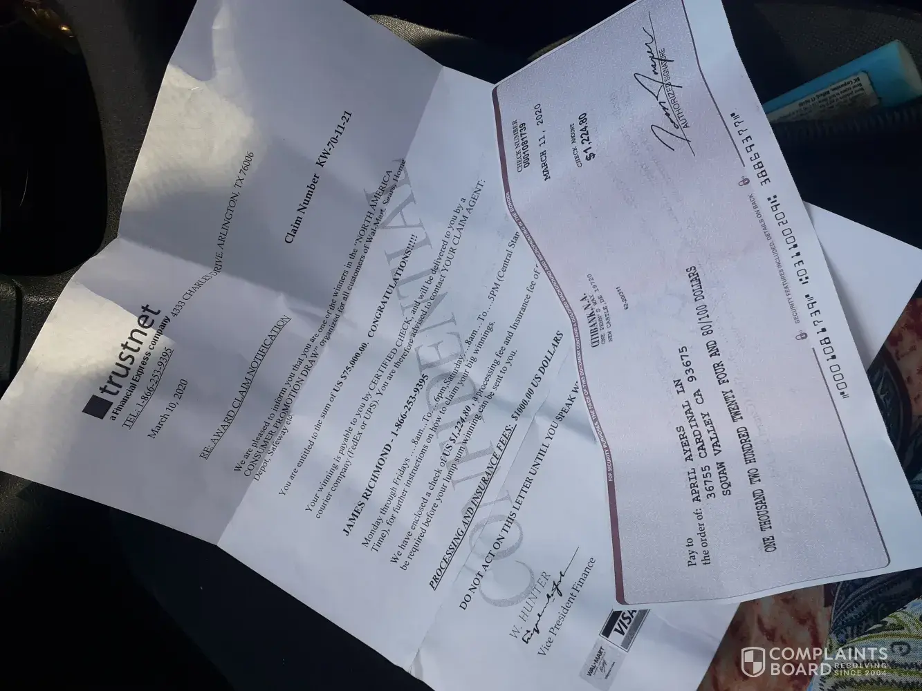 I received a letter from trustnet saying that I was entitled to $75, 000.00. I called the claim agent to ask her about it & she said to call her back in 10 minutes. While I was waiting I looked up trustnet on the computer & it said this was a scam, with other people complaining about the same thing. I never called the agent back! The date on the letter was September 26, 2019. claim Number is SW-70-90-28. They enclosed a check for $1, 224.00. they said a processing fee and insurance fee of $1, 000.00 will be required before your lump sum winning can be sent to you. Trustnet also had another telephone number at the top of the letter...1-877-680-5935.The claims agent who is Samantha Fiaher telephone number is 1-877-765-9834. the letter is signed by W. Hunter, vice President Finance.