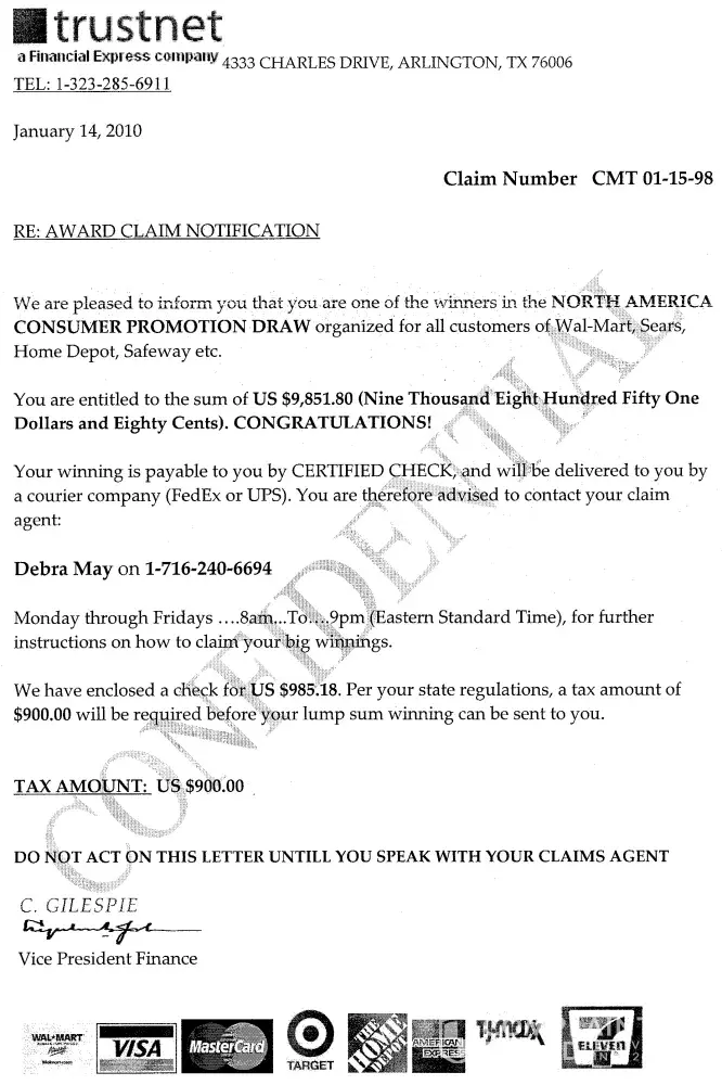 I received a letter today that included a cashier's check. the letter was an award claim notification. it stated: "we are pleased to inform you that you are one of the winners in the north america consumer promotion draw organized for all customers of wal-mart, sears, home depot, safeway etc. you are entitled to the sum of us $9, 851.80 (nine thousand eight hundred fifty one dollars and eighty cents). congratulations! your winning is payable to you by certified check, and will be delivered to you by a courier company (fedex or ups). you are therefore advised to contact your claim agent: lisa greene on [protected]. monday through fridays...8am... to...9pm (eastern standard time), for further instructions on how to claim your big winnings. we have enclosed a check for us $985.18. per your state regulations, a tax amount of $900.00 will be required before your lump sum winning can be sent to you. tax amount: us $900.00. do not act on this letter untill you speak with your claims agent." the letter was signed c. gilespie, vice president finance. everything looks legitimate, although there were typos and grammatical errors. I immediately googled the company and realized that others received the letter and check and that it was a scam. thank you for providing this valuable service to consumers.