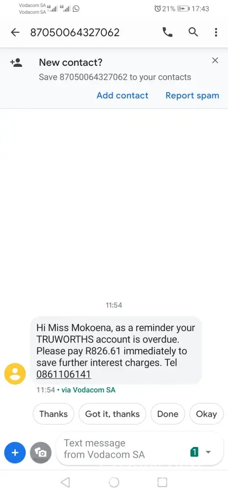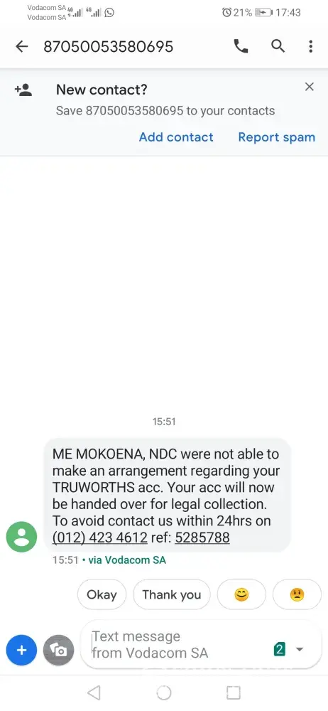 My name is mapule mokoena, i was supposed to pay R436 but i only managed to pay R300. now i recieve messages as if i said i dont want to pay what i owe i have sent 3 different messages that i received and i dnt know why am i treted this way.I will pay R850 month end why am i being handed over? is this how customers are treated? as for the sms from ndc i asked the lady which account she was talking about and she didnt tell me, did she really expect me to confirm my date of birth when she wont tell me which account she was calling in connection with? please clearify this matter