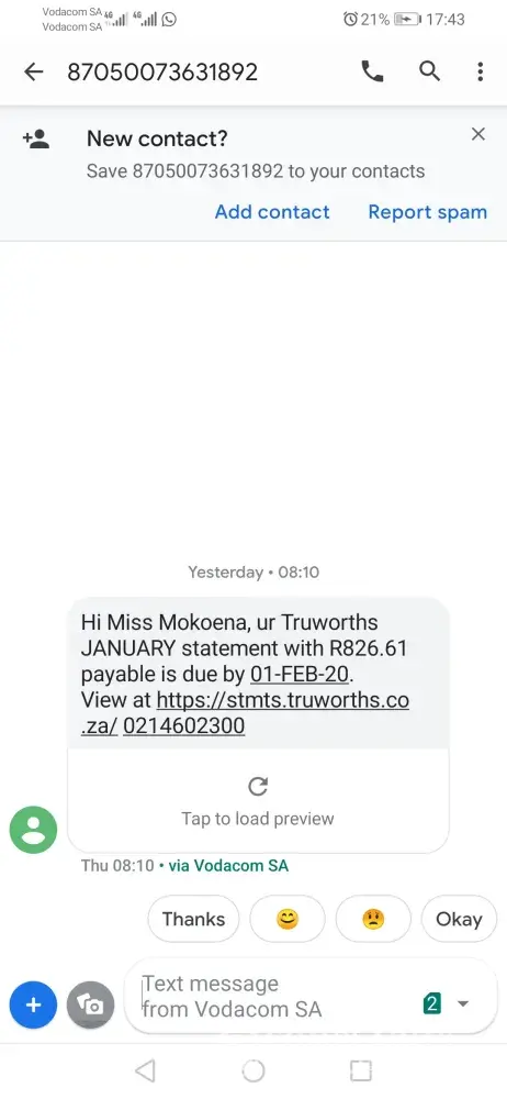 I received an sms from no - =[protected], today 18 November 2019 at 12.06