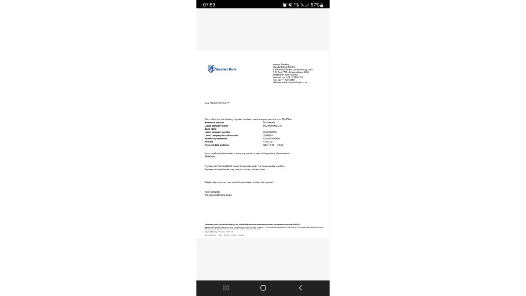 On the 01/12/2022 I received a reminder about paying my account and it was an sms with a link that I uses to pay my account however I received a call this morning at 7am the number is +[protected] after that I received an sms reminding me of paying my account and I am confused because I have already paid using the online option and it was a link sent from Truworths. Will you please assist because I have already paid.
