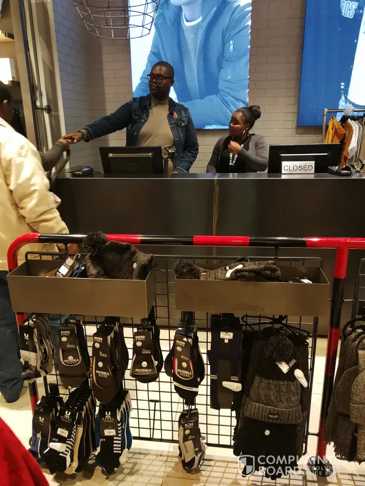 The staff in the store have no sense of urgency. They are chatting to themselves. There are two till on the men's side but one is operational with two staff working in one till.