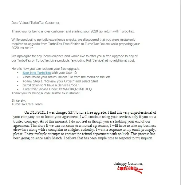 I have emailed several times, talked to a few agents, and filed four times for a refund! They will not address this issue! I have been a turbo tax customer since 2013. this year they sent me an email for a free upgrade being I was laid off due to covid and was forced to upgrade my filing status. they charged me anyway. I realize it may only be $37.00 and some odd cents, but that was the money they offered to not charge me. then did anyway. I find this to be rude and unprofessional. I will not be filing my tax with them again due to the lack of customer care.