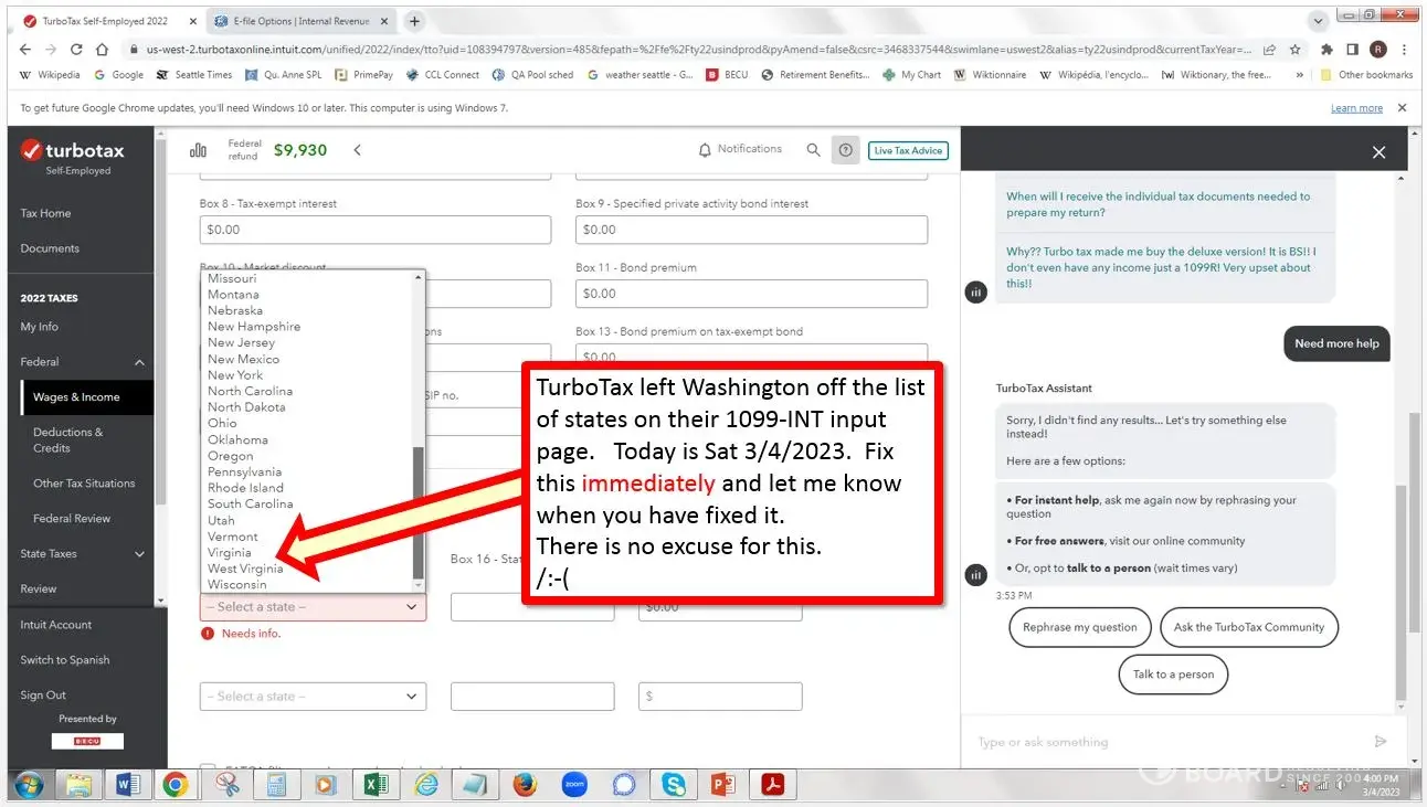 This egregiously careless error makes it impossible for people who bank in Washington state to use Turbotax successfully.