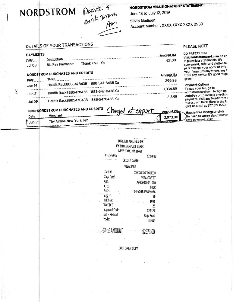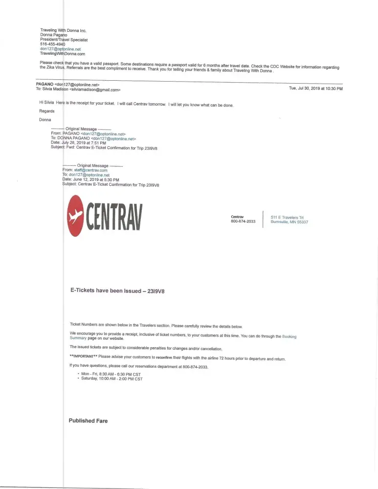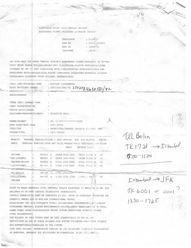 Attached you will find my original itinerary, booked through CENTRAV withTurkish Airlines, travel dates June 25 - July 17, Airline reference SDFZU5, flying from the USA to Kazahkstan, then to Germany, and back to USA, for $1, 862.73 . I accidentally missed the day of my flight as it was 12:10 AM and instead, went the day after my departure by accident (please change these times to ll:55pm instead, as I was told it happens often by your own agent). My mistake, but you cancelled my entire itinerary for the next three weeks! Someone had to rebook all my flights using my original itinerary that I handed her at your counter. When she asked for an additional $2, 973.00 to rebuy the same tickets that you cancelled I was absolutely shocked.
