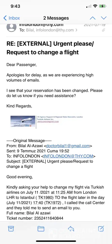 in Istanbul to make the change, I kept calling them and sending email to your office in Canada without success, I ended buying new ticket and the previous