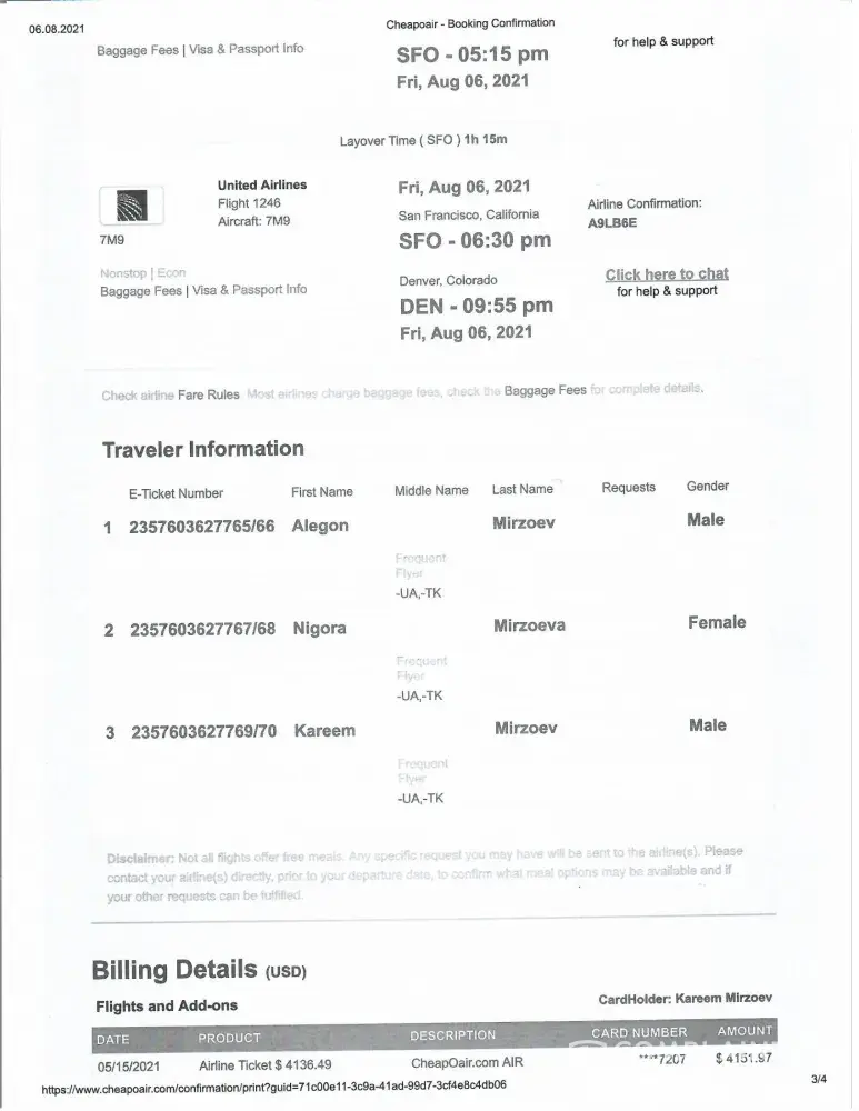 One of passenger of this booking had to purchase new ticket and already left tajikistan to usa, but we nigora nelli mirzoeva and kareem mirzoev - are usa citizens and our tourist visas for this country will expire soon and we must leave this country.