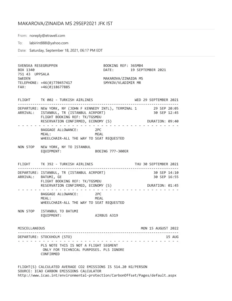 My name is Zinaida Makarova. My husband, Vladimir Smykov, and I bought tickets for September 29, 2021 for the flights from New York to Batumi through Istanbul.