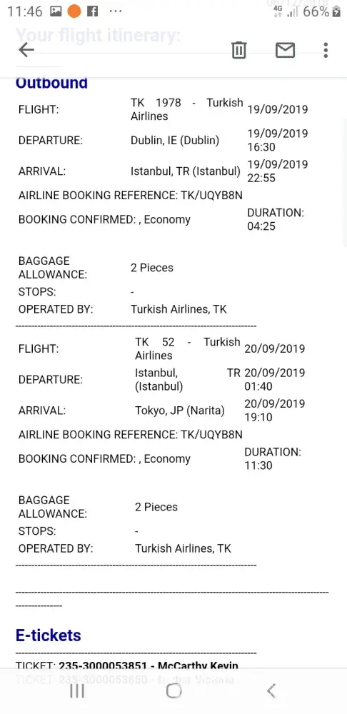 After great difficulty, through ringing the Turkish airlines helpline, we managed to have our flights rerouted to fly out for Dublin on the 21/09/19. We had to make three phone calls to confirm.