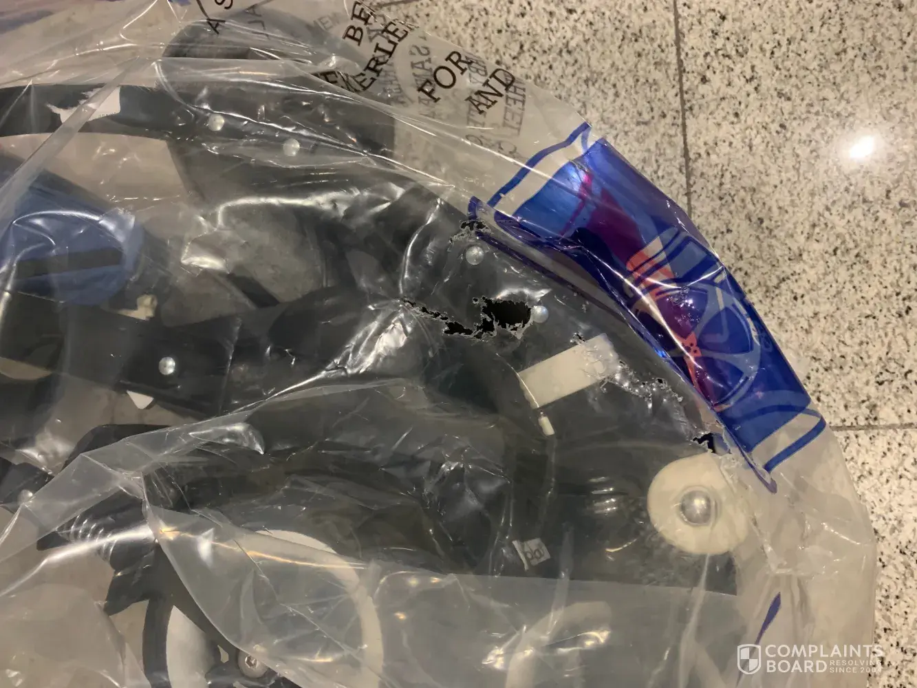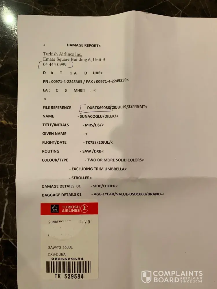 I traveled from Sabiha Gokcen (SAW) to Dubai (DXB) with my family. Our baby stroller has been damaged. It was in a plastic bag, but the bag was torn and the stroller got scratched.