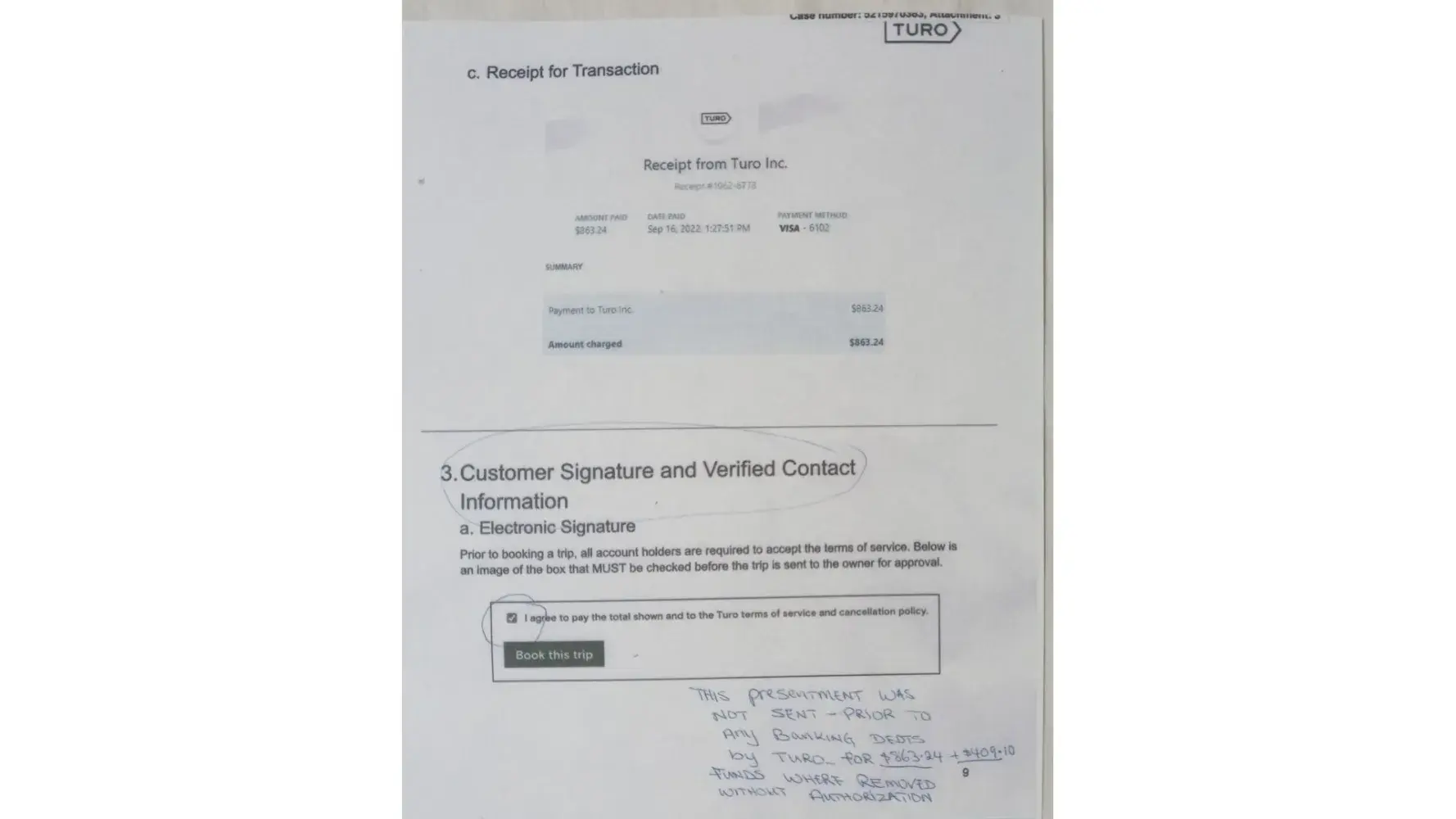 The “Electronic Signature†was a link sent for my initial vehicle rental approval for the first amount when I signed up to rent the first car from Turo.com. However shortly after no link to approve payments were sent on the Turo account and random withdrawals and credits were being shown on my banks account started showing up. Turo Chat contact service records are not available to show Turo representatives were contacted several times to stop random bank withdrawals and agreed to investigate. Some funds were returned however 8/31/2022 $409.10 and 9/17/2022 $863.24 withdrawals were not authorized and not refunded. No “Electronic Signature†link to approve payment given to Turo representatives to access my bank. There is no product or service receipt that I received from Turo costing $409.10 this was fraud to withdraw and not return funds. I was not on the Turo account to initiate approval for Turo to withdraw payment $863.24 from the bank account and the Visa card#6102 was deleted from the Turo account by 9/7/2020. Turo representatives are using the “Electronic Signature†as a blanket for unauthorized access and withdrawal from my bank account. Please note the correct amount for 9/7/2022 withdrawal is $863.24 see attached Turo receipt. The $863.24 Turo receipt shows this amount is for damages however this should be processed as a claim with the Progressive insurance and Turo Traverlers insurance carriers that was given to me at time rental trip began. I have no authority to waive legal vehicle insurance for operating a vehicle on the roadways. Attached are insurance policies given to me at time of rental for Kia. To my knowledge, Turo is not registered in New Jersey to operate business or waive New Jersey vehicle requirement insurance and registration rules. Turo's own documents also show vehicle insurance and registration is mandatory before a rental trip begins however instead of processing insurance Turo representative withdraw damage amount from my bank account without authorization. Please investigate.