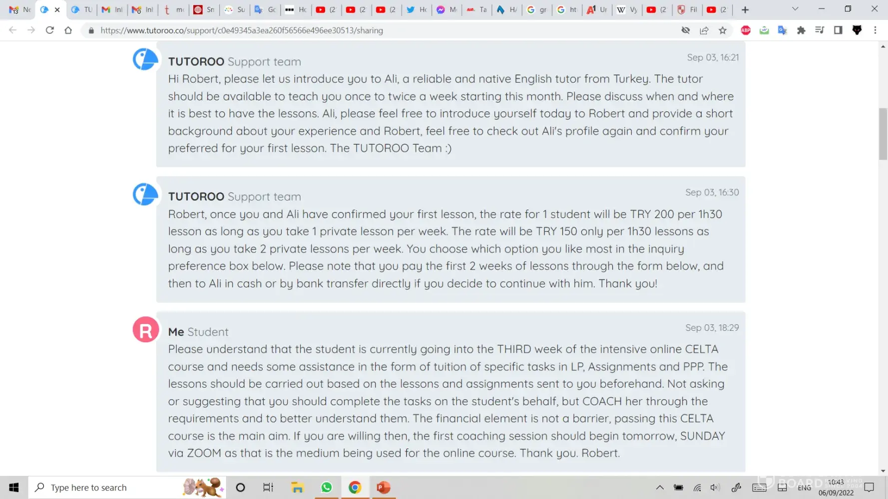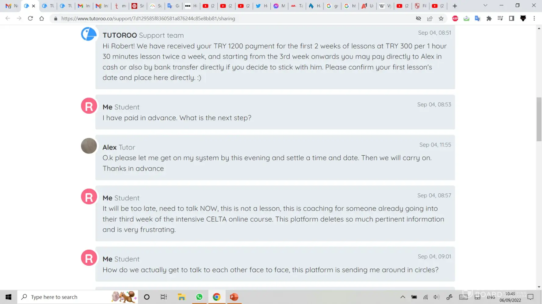 On Sunday 04/09/22 I was trying to find a CELTA (Cambridge English Language Tutor, Adult) Tutor/Coach for my wife who was struggling with certain aspects of the course. I had message exchanges with a Tutor named ALI/ALEX in Istanbul, but he did seem to know how to establish an online lesson and it was obvious that my specific requests had not been passed on to him.
