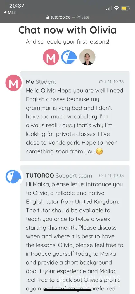 I was in contact with Tutoroo.co for more than 2 month and I contacted a teacher who's name was "Lily" and she claimed that she is from the UK. We kept on contact for 2 month via Tutoroo messaging service and as soon as I paid for her first 2 weeks (4 lessons), she declined because she is suddenly offered a job! And when I asked my money back, Tutoroo refuse, although they see it was not my fault.