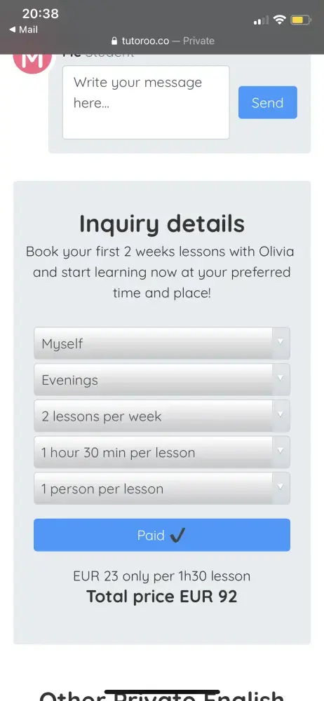 I paid for 2 lessons but the tutor was unsuitable. I tried another tutor and I was asked to pay more money but I did not as she was also unsuitable.