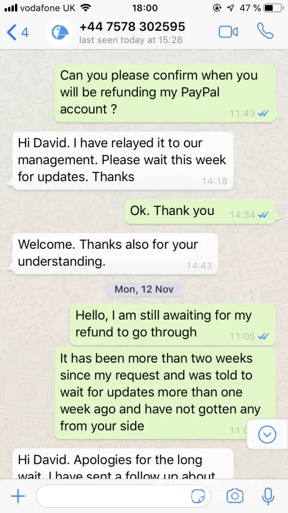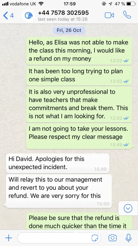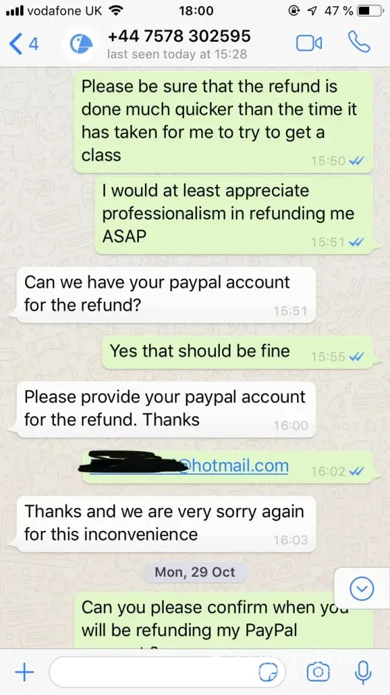 I was meant to get a refund when a French class couldn't be scheduled on time. It has not arrived, although the whatsapp contact has promised this three times now. Initial payment was made November 14th and my email (which I signed up with) is [protected]@outlaw.ie and phone is [protected]. See whatsapp exchange below.
