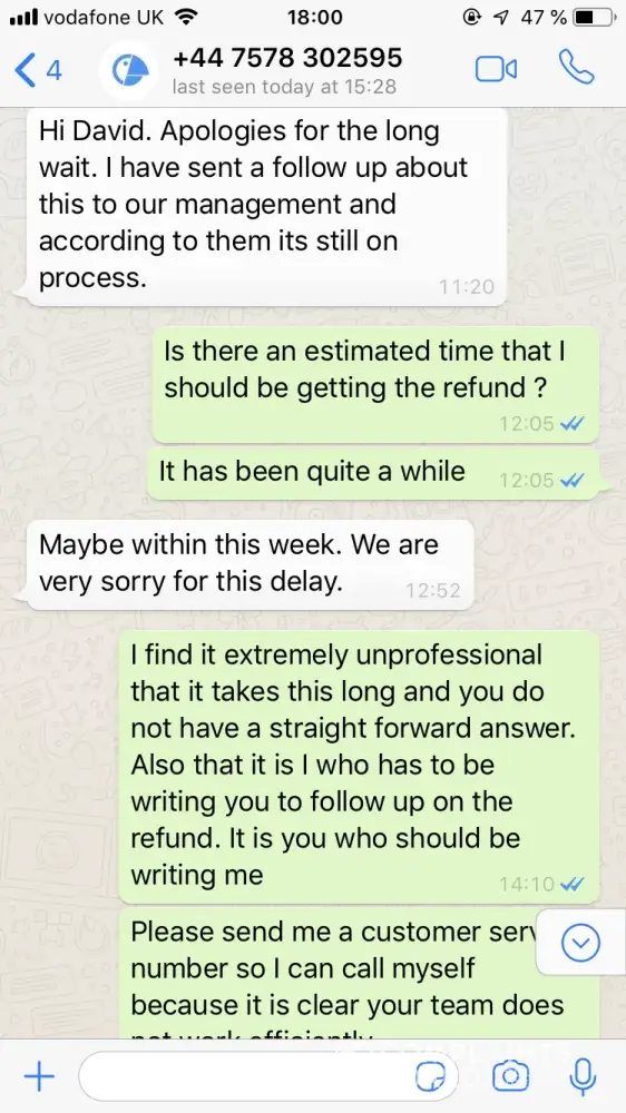 I have even written their manager Nicole Vanhove to try to get this resolved. I have also written them through their site and after asking for my details, they have not reached out. This company has no Customer Service number or anyone you can actually speak with for any issues. It's all on Whatsapp which absolutely terrible service. I paid 80 GBP which is quite a lot of money for two classes and for them it means NOTHING.