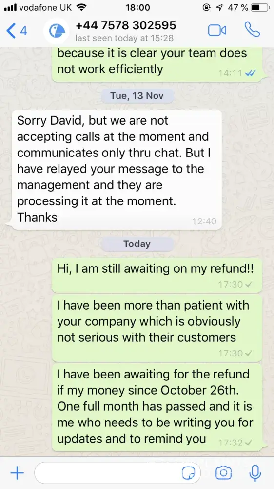 Attached the whatsapp conversation for your reference. the date is from 13 Nov. until now. There is no response. The company founded in Singapore. It is the online criminal.