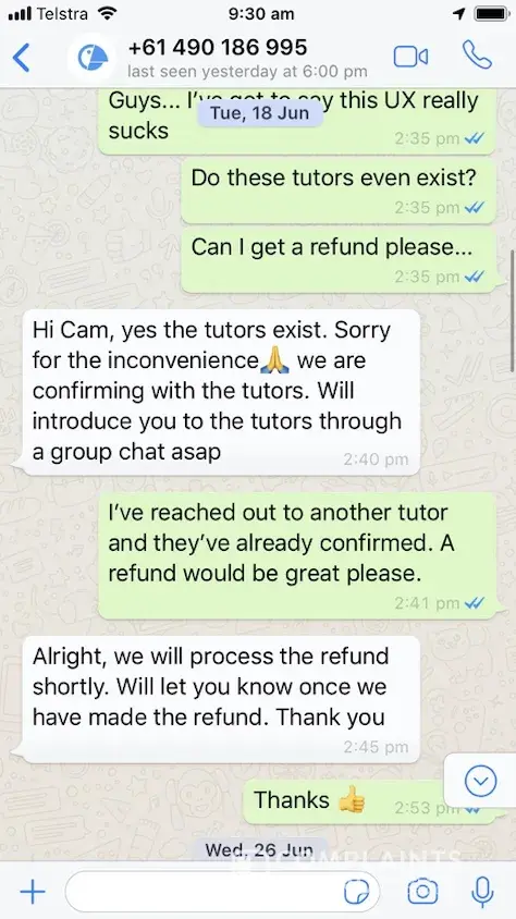 After a poor experience with Tutoroo service, I requested a refund and was advised by Sofia (+61 490 186 995) on 2:45pm AEST on the 18 June 2019 that a refund would be processed.