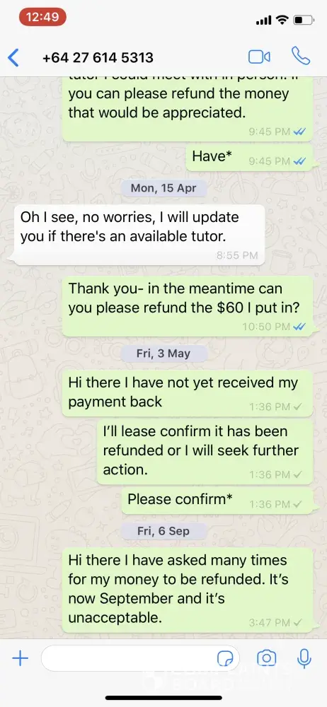 I asked for a refund of my initial $60 sign up in April this year as a tutor was unable to be found in my area (incompatible time and I didn't want to do online tuition as this hasn't worked for me in the past). After noting my refund was going to be processed I waited the standard 30 days as they told me to do. Nothing was processed. I have subsequently followed up many times (via Whatsapp and email) and there has been no further follow up apart from saying someone from the Wellington team will be in touch, which they have not been. Absolutely terrible service. I might have been inclined to use them again but this experience has shown me they are not to be trusted. I am going to continue to push for my refund and will find every mechanism to formally lodge a complaint until I receive it.