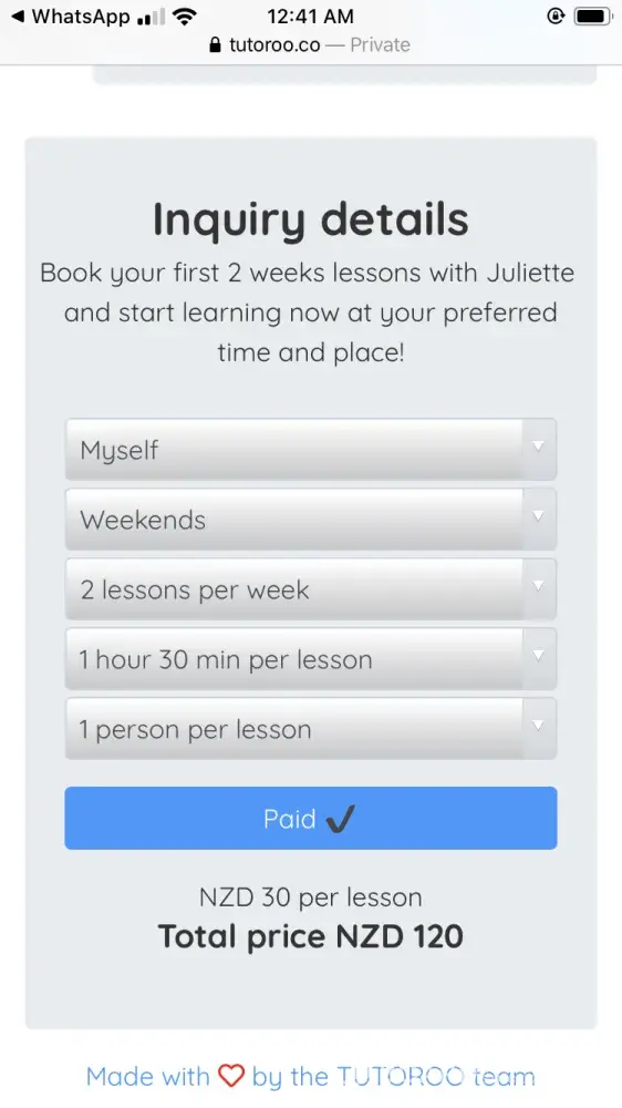 After I signed up on Tutoroo, they found a tutor, who surprisingly disappeared after I payed 120NZD for the first 2 weeks of studying.