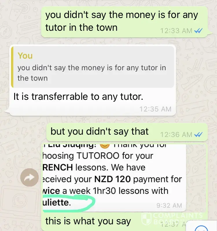 They say rhe money is for that specific tutor when I make the payment, but later they say that the payment is transferable to any tutor in town when they refuse to refund me.