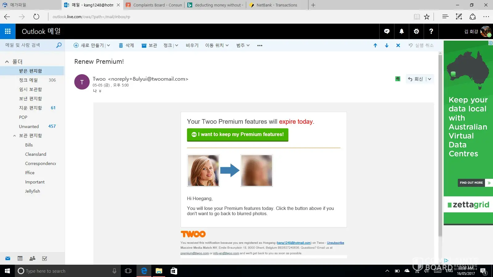 I submit a complain on 28/06/2017 and asking for a refund of Twoo premimum and next day I got reply from Alexandra that she is arranging for refund. The refund not yet reflected in my credit and other hand twoo again deducted from my credit card.