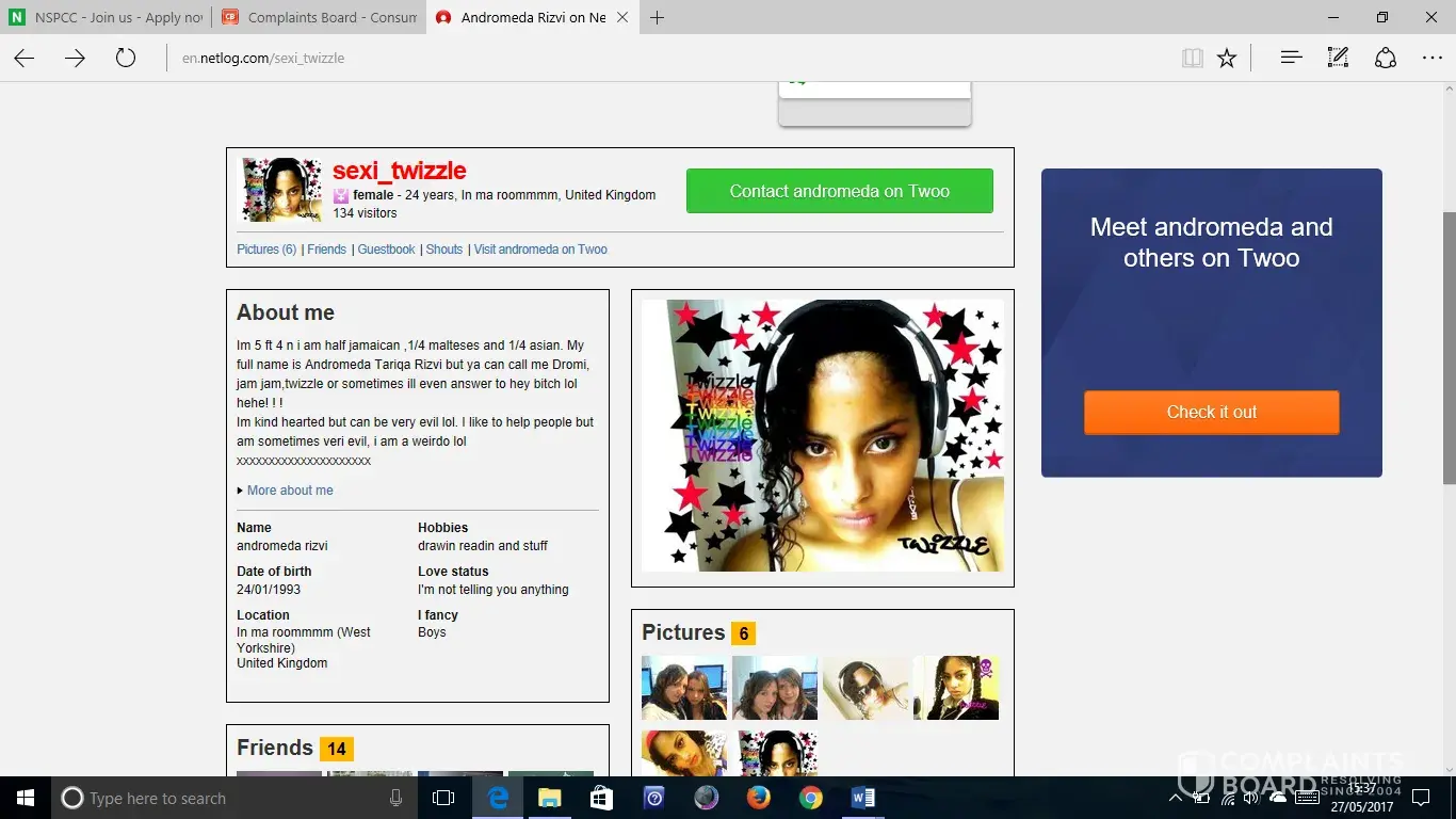 I am complaining about a Twoo/Netlog (part of the same company I believe) page that is a fake, and is using images of me as a child (under 16 at the time). I have come across this page this week and I wanted to report this page but whenever I try to use the 'Report Abuse' feature it doesn't come up with a security code which then stops me from reporting this page. I believe the page has actually been around for some time (states 2007) but I haven't set this page up myself as in 2007 I would have been under 16 years old!