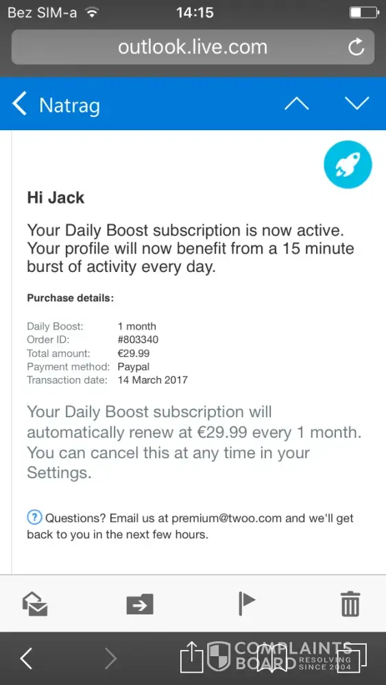 unauthorized payment $92.99 for 3 months of twoo boost pack on my paypal