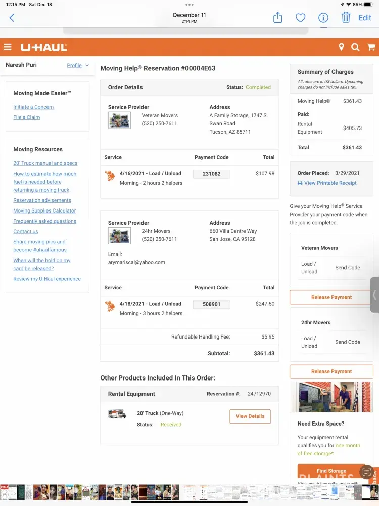 My idea of a satisfactory resolution to this total fiasco would be that $50 voucher plus free furniture and appliance dolly rental plus 3 months of free storage. Or a $100 refund on our rental this weekend of August 7th, 2021, assuming that everything goes through as you would normally expect of such a major long-standing company.