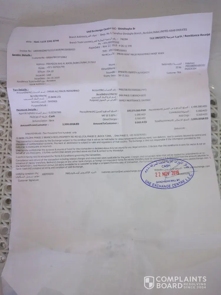 It was only a small amount, just 800 aed, but my wife needed it for medical use to give birth for my 3rd child. Due to this unfortunate experience, I will never again do any further transactions with UAE Exchange to send money abroad.