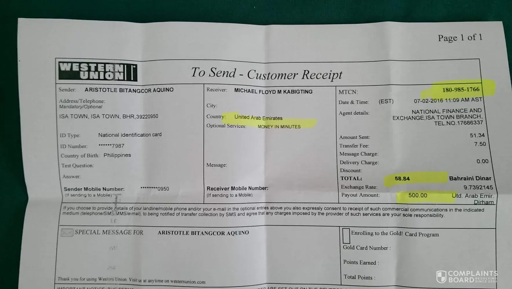 The worst exchange ever, I send money to Pakistan. The receipt I got from exchange had the correct information regarding the receiver name i.e. Obaid ur Rahman.