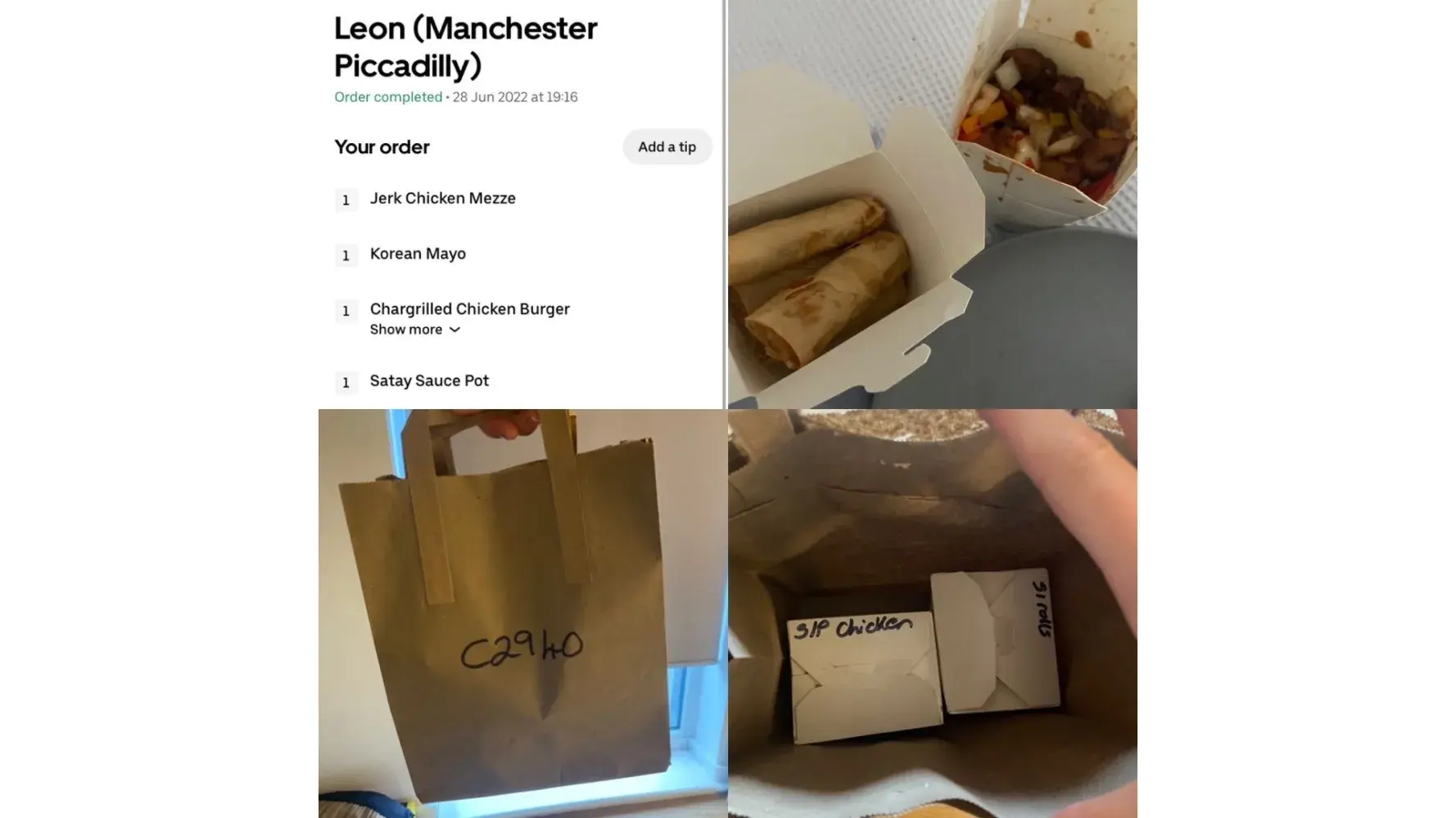 I received the wrong order on 28/06. The driver passed me my order for me to get back into my house and find he has passed me the incorrect order which was someone else’s. My order was from leon via order No. #AD8A0. I received an order from Rice which on the bag specified order No #C2940