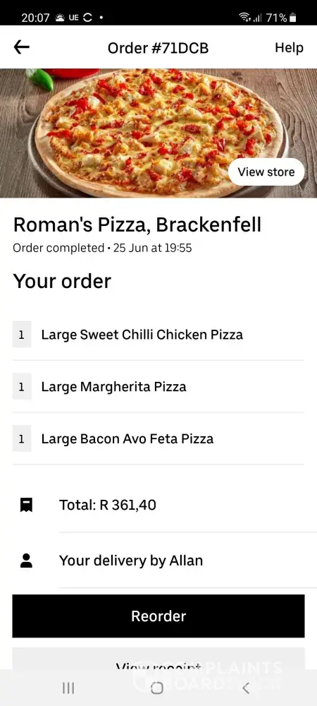 I ordered 3x pizzas from Roman pizza through UberEats. When the delivery guy called Allan arrived after 1 hour he had the wrong delivery(1 instead of 3 pizzas). He Allan then took off to rectify the wrong order. After another 25 minutes Allan slowly drove past our house again and then it appeard on my app as delivered although we receuved nothing!. This is theft and i want this delt with. I received NO pizza and R361.00 got stolen from me!