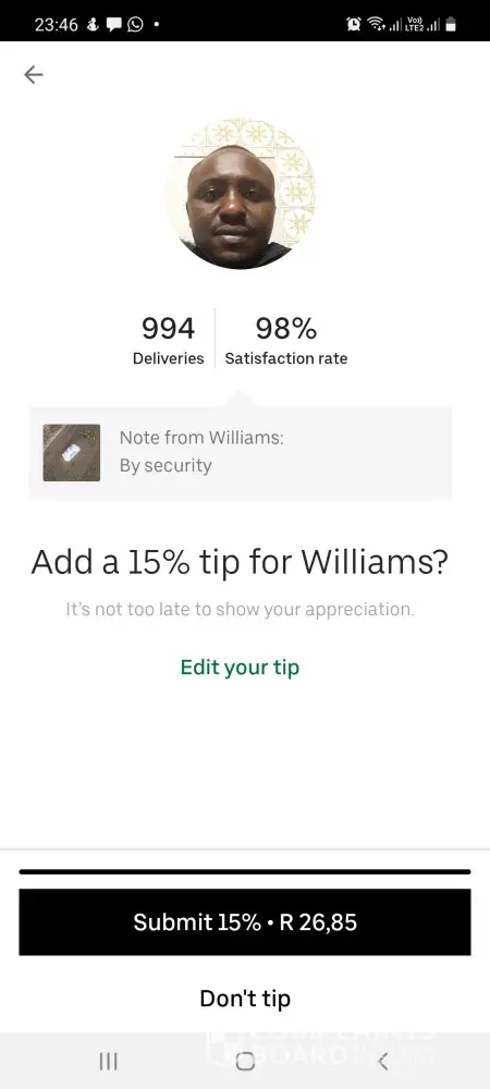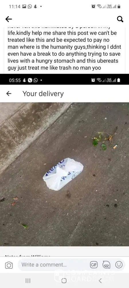 Uber Eats so on Saturday 21/08/21 was at work/on call busy as crazy with trauma emergencies and hungry as I was I ordered food via the app on ubereats from oceanbusket emmerencia;so after like roughly 35mnts I got a call from this very rude driver by the name of Williams asking me if I can't read my messages blaaa blaaaa and he is by the security gate, he ddnt even confirm which security gate but he dropped his phone, tried calling him back his number took me to a switchboard that couldn't help me too. so I went to the security gate where I told him ill meet him from the app ; they all said we ddnt see any ubereats driver at all and all of a sudden I see a picture of my food on the app like this and guess what he had completed his trip, left the food just like that and the app is now saying I must pay the order that was left like this somewhere on the streets of Johannesburg. lets say I finally received my order would you eat such food left like this on the streets;I never felt this humiliated by a person in my life. kindly help me share this post we can't be treated like this and be expected to pay no man where is the humanity guys, thinking I ddnt even have a break to do anything trying to save lives with a hungry stomach and this ubereats guy just treat me like trash;I tried complaining on thier app no reply on thier side I tagged them on social media still no reply clearly Ubereats doesn't care about thier customers
