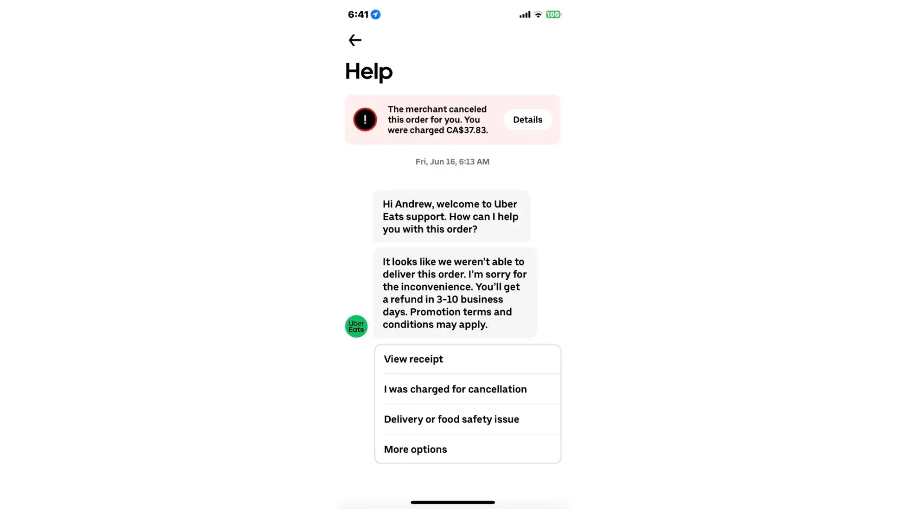 The restaurant from which I ordered fish and chips on June 4th (Oak Bay Seafood) through my Uber Eats App cancelled my original order to allow me to immediately make another order that included an additional piece of halibut. The Uber Eats App noted the cancellation and went on to say that, because I had already been charged ($37.83) for the cancelled order, a refund would be issued in 3-10 business days. (see screenshot of App message below). After waiting 10 days with no refund being issued, I contacted Uber Eats through the help function on the App, only to be told that no refund could now be issued because I had not contacted them within 48 hours of making the order. Notwithstanding repeated attempts to point out that it made no sense for me to contact them within this time frame given the commitment I had previously received to be provided a refund within 10 business days, I kept getting formula responses through the help chat saying that no refund could be issued because I had not contacted them within 48 hours of placing the order.