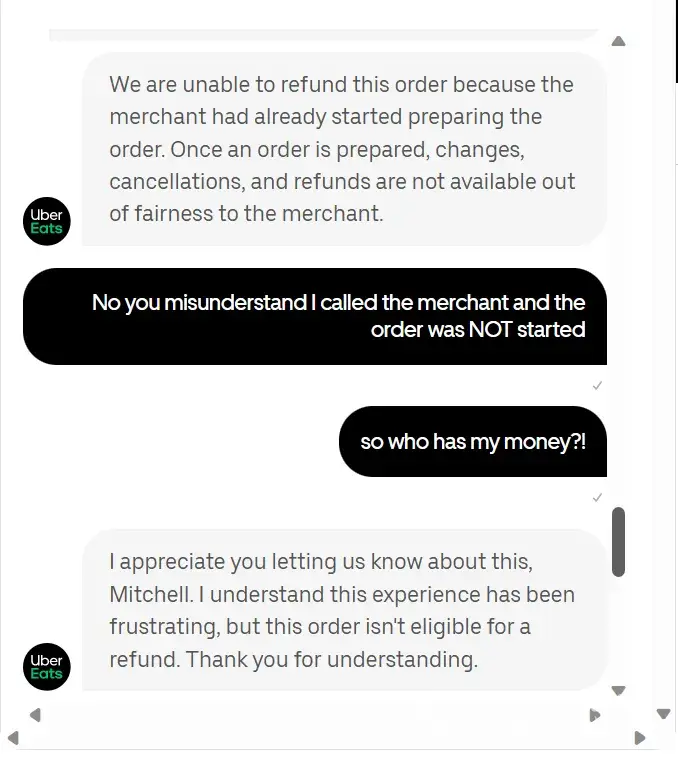 Desired outcome: If u pay for services that you do not receive you should in fact be refunded, Uber eats keeps the money and does not render service period