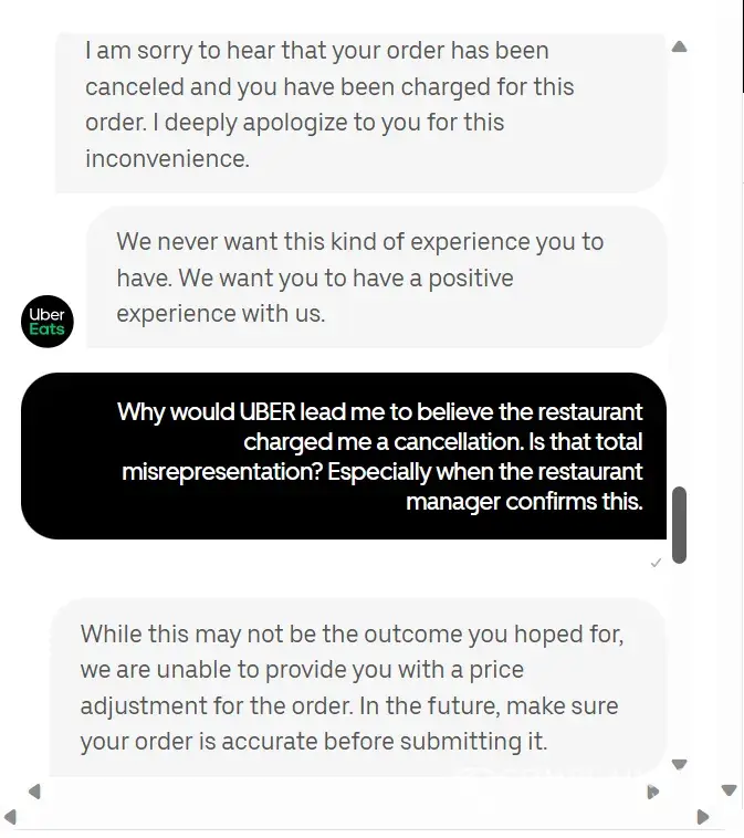 Received an email from uber eats that stated I was being charged for a cancelled order because the merchant had already started the order, untrue I immediately called the merchant to let them know I placed the order at the wrong location and do not proceed with the order. I was instructed to contact uber eats or use the app to cancel. Which I immediately did. Today I found a notice in my email of a cancellation charge for $18.67. I contacted the merchant appleby's greer, sc location and spoke to the manager kenny. He told me that they do not charge cancellation fees on product, even if the food is prepared. It's just not policy. I then contacted uber eats. Attached are the snaps of the (so-called) support chat. Chats are sequentially labeled from 72-84 disregard missing snaps as they are unrelated to these.